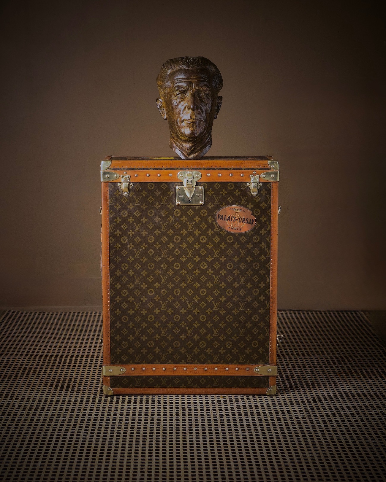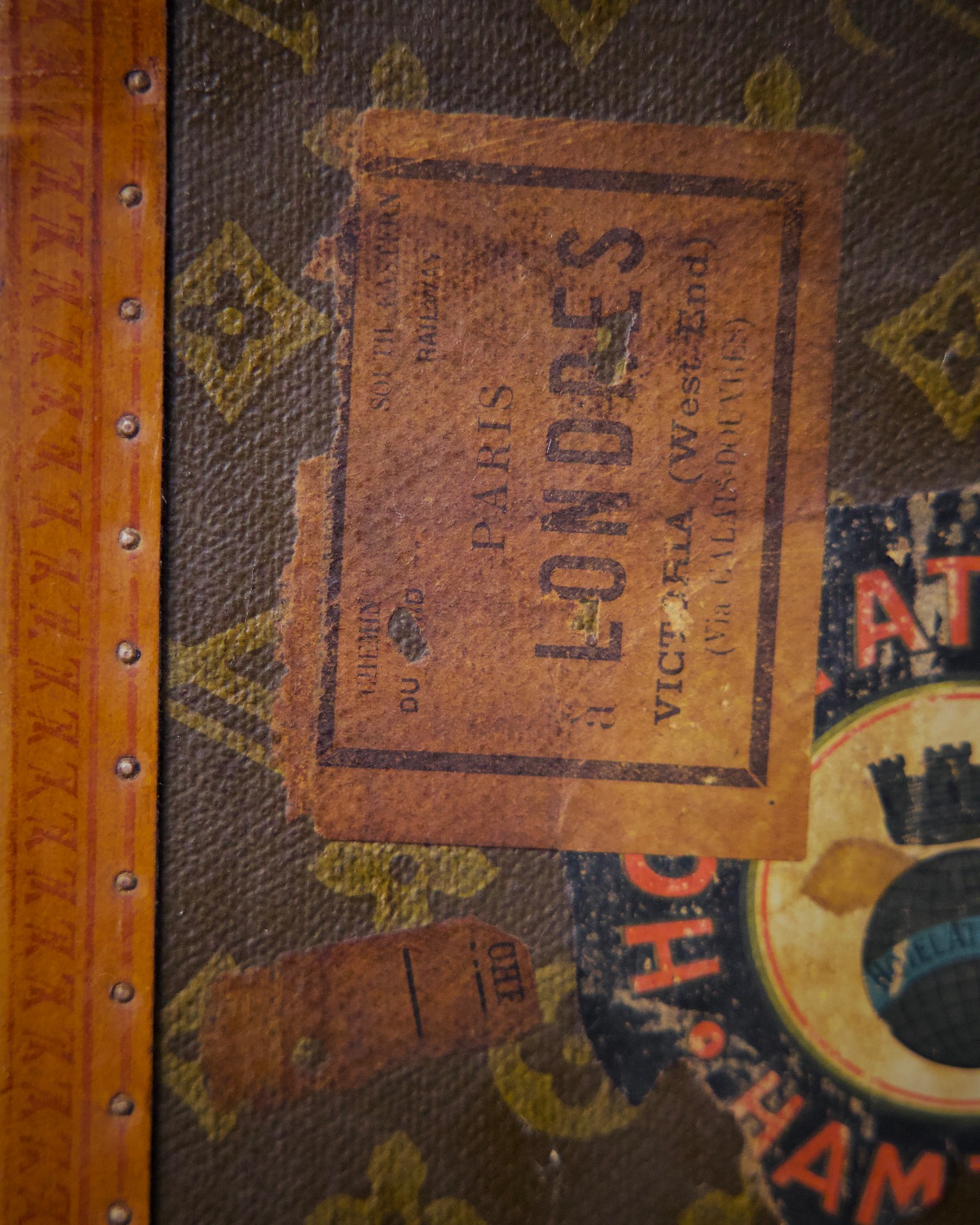 This rare Louis Vuitton standing wardrobe suitcase trunk, circa 1930’s, features a crisp monogram canvas, all brass hardware, and lozine leather trims. Top of the line model. Well traveled with several shipping and hotel labels. Includes a complete and detachable original interior with LV hangers and compartments. Made with 6 closing brass latches. Excellent condition considering age – Wears and marks, signs of use and travels. Quite a rare and versatile format, could be used as a pedestal, night stand, center piece, or even storage element.